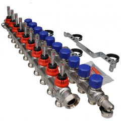 Fraenkische 10 ağızlı debi göstergeli paslanmaz çelik kolektör, yerden ısıtma sistemlerinde güvenli ve verimli dağıtım sağlar.