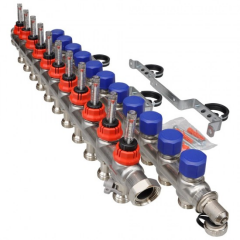 Fraenkische 11 ağızlı debi göstergeli paslanmaz çelik kolektör, yerden ısıtma sistemlerinde güvenli ve verimli dağıtım sağlar.