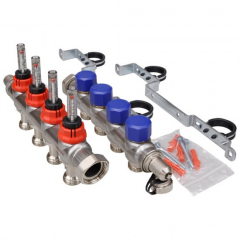 Fraenkische 4 ağızlı debi göstergeli paslanmaz çelik kolektör, yerden ısıtma sistemlerinde güvenli ve verimli dağıtım sağlar.