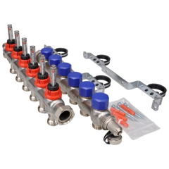Fraenkische 6 ağızlı debi göstergeli paslanmaz çelik kolektör, yerden ısıtma sistemlerinde güvenli ve verimli dağıtım sağlar.