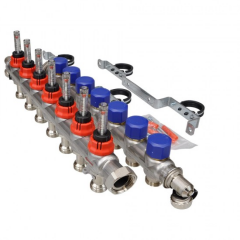 Fraenkische 7 ağızlı debi göstergeli paslanmaz çelik kolektör, yerden ısıtma sistemlerinde güvenli ve verimli dağıtım sağlar.