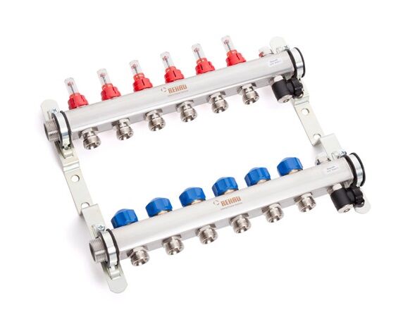 - Uygulama: Yerden ısıtma veya soğutma devrelerini bağlamak için dağıtıcı ve kollektör dolabında toplayıcı olarak kullanılır. REHAU kollektör dolabına veya doğrudan duvara monte edilmek üzere DIN 4109 uyarınca ses yalıtımlı konsollara önceden monte edilmiştir.